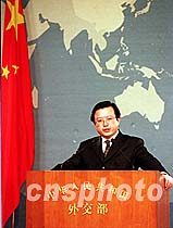 中國外交部發(fā)言人朱邦造四月三日在北京的記者招待會上,談到美國偵察機(jī)一日撞毀中國軍用飛機(jī)事件時(shí)說,中國海軍正在全力搜救我方落海飛行員。中新社記者 鄒憲 攝