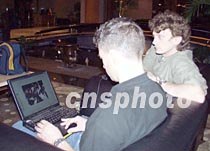 四月三日夜間至四日凌晨,?谖娜A大酒店中外記者云集,準備采訪美國駐華使館預(yù)定在這里舉行爾后取消的記者招待會。圖為兩名美聯(lián)社記者在現(xiàn)場用電腦發(fā)稿。中新社記者 莫成雄 攝