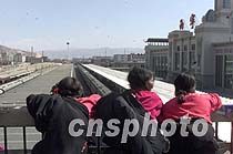 來自拉薩的藏族婦女在西寧火車站天橋上觀看即將出發(fā)的列車,盼望抵達拉薩的青藏鐵路早日建成。青海省西寧火車站是未來青藏鐵路的起點。中新社記者 毛建軍 攝