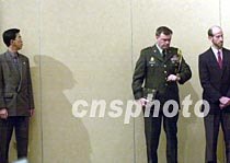 美國駐華使館國防武官席樂高準將晚間在?谂c美機組人員見面后,忙于在文華酒店出席海南省外事辦公室舉行的新聞發(fā)布會時抓緊看表,之后要立即向美國報告。中新社記者 賈國榮 攝