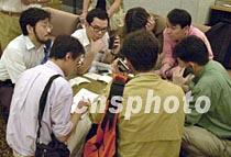 一批日本記者連日在海南省?谖娜A大酒店整天追蹤采訪美國軍用偵察機(jī)撞毀中國戰(zhàn)機(jī)事件,獲得報(bào)道信息后往往圍在圓桌邊共同分享。中新社記者 賈國榮 攝