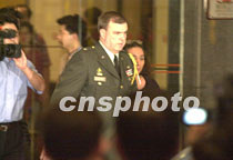 美國駐華使館國防武官席樂高準(zhǔn)將十日晚七時許走出?谖娜A大酒店,乘中方車輛前去與美機組人員見面。中新社記者 賈國榮 攝