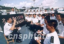 中國海軍駐海南的艦艇部隊(duì)官兵日前聽取部隊(duì)領(lǐng)導(dǎo)介紹四月一日撞機(jī)事件的情況。中新社圖 龍運(yùn)河 攝