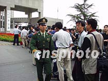 十八日下午在北京外交部門前等待中美撞機事件談判消息的中外記者聚集在一起。中新社圖 宋吉河 攝