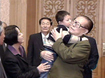 中國國家主席、中央軍委主席江澤民二十日在北京人民大會堂會見被美機(jī)撞毀戰(zhàn)機(jī)而犧牲的飛行員王偉的家屬時(shí),抱起王偉的兒子相互親吻。