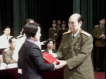 中央軍委二十四日在北京隆重舉行授予王偉“海空衛(wèi)士”榮譽稱號命名大會,張萬年向王偉烈士的妻子阮國琴頒發(fā)授予王偉的一級英模獎章和榮譽證書。
