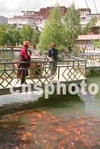 西藏拉薩市布達(dá)拉宮下的廣場水池中放養(yǎng)了許多錦鯉,形成世界屋脊觀魚的新景觀。中新社記者 趙振清 攝