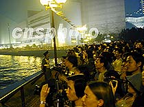五月八日晚在香港舉行的祝賀“2001年《財(cái)富》論壇”煙花匯演上,無(wú)數(shù)市民爭(zhēng)相涌上街頭一睹絢麗多彩的煙花。中新社圖 洪少葵 攝