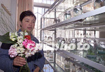 西藏自治區(qū)高原生物研究所的米瑪潘多日向人們展示她們培育出的高原鮮花,她和另外三位女性研究人員培育出很多適應(yīng)高原環(huán)境的花卉,美化了西藏人的生活。中新社記者 滿會(huì)喬 攝