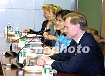 石廣生會(huì)見美貿(mào)易代表 雙方還將進(jìn)一步商議 2001年6月5日 15:44 ![]() 石廣生與美國貿(mào)易談判代表羅伯特·佐立克一行會(huì)晤。中新社記者 潘索菲 攝 ![]() 二○○一年APEC貿(mào)易部長會(huì)議將于六月六日開幕。會(huì)議主席、中國外經(jīng)貿(mào)部部長石廣生和中國代表團(tuán)團(tuán)長、外經(jīng)貿(mào)部首席談判代表龍永圖,五日在上海國際會(huì)議中心與經(jīng)濟(jì)體代表團(tuán)團(tuán)長舉行雙邊會(huì)談。圖為美國貿(mào)易談判代表羅伯特·佐立克。中新社記者 潘索菲 攝