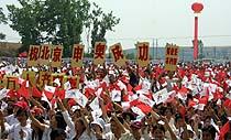 圖文:西安萬(wàn)名學(xué)子世紀(jì)老人共祝北京申奧成功 2001年6月6日 09:34 ![]() 6月5日上午,民辦高校西安翻譯學(xué)院二萬(wàn)二千多名學(xué)生舉行規(guī)模盛大的歌舞表演,與“北京——莫斯科申奧萬(wàn)里行”車隊(duì)一起聯(lián)歡,共同為北京申奧吶喊助威。魏孝明 攝 ![]() 西安“世紀(jì)老人”王耀東是中國(guó)百年體育發(fā)展史的參與者和見(jiàn)證人。6月5日下午,鳳凰衛(wèi)視和“萬(wàn)里行”隨行記者在家里采訪了王老。他向記者們講述了當(dāng)年參加遠(yuǎn)東運(yùn)動(dòng)會(huì)的情況,并表示盼望奧運(yùn)會(huì)能早日在中國(guó)舉辦。魏孝明 攝