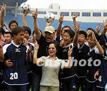中新網(wǎng)西安6月6日消息:(記者呂振亞)古城西安熱情,古城民眾好客!叭f(wàn)里行”車隊(duì)在西安逗留第三天,我們已溶入這個(gè)千年古都,我們已與古城民眾心心相印。 萬(wàn)名學(xué)子齊聲呼喊的壯觀場(chǎng)面歷歷在目,世紀(jì)老人熱切期盼的凝重目光烙印在心。鳳凰衛(wèi)視把一幅幅感人的畫面?zhèn)飨蚴澜,隨行記者把一段段動(dòng)人的故事獻(xiàn)給讀者。 我們就要離開西安繼續(xù)西進(jìn),沿著“絲綢之路”,開始遠(yuǎn)征莫斯科的“申奧之旅”。今天,我們來到陜西國(guó)力足球隊(duì)訓(xùn)練場(chǎng),與隊(duì)員們相約,與球迷們相聚,與西安民眾話別。 下午四點(diǎn),鳳凰衛(wèi)視邀請(qǐng)的“明星隊(duì)”一出現(xiàn)在訓(xùn)練場(chǎng),看臺(tái)上的球迷們掌聲四起。由香港影星成奎安和內(nèi)地歌手高崎組成的“明星隊(duì)”雖然勢(shì)單力薄,國(guó)力隊(duì)球員仍與之展開了傳球“對(duì)抗”,鳳凰主持人曾靜漪小姐也上場(chǎng)助陣,四處“奔波”,“忙”得不可開交,看臺(tái)上的球迷不時(shí)呼喊助威。 陜西國(guó)力隊(duì)負(fù)責(zé)人為我們的到來破了規(guī),特準(zhǔn)正在指導(dǎo)訓(xùn)練的外籍教練卡洛斯接受了我們的采訪。這位教練對(duì)“申奧萬(wàn)里行”活動(dòng)已有所耳聞,他微笑著一一回答了我們的提問:“你對(duì)北京申奧的前景有何看法?”“中國(guó)體育發(fā)展很快,北京已完全具備舉辦奧運(yùn)會(huì)的條件,我很希望看到北京能主辦奧運(yùn)會(huì),祝北京成功!”教練的話還沒有經(jīng)過翻譯,但那種肯定的語(yǔ)調(diào)已讓我們明白。 “比賽”結(jié)束了,看臺(tái)上的球迷余興未盡,不時(shí)沖著成奎安喊:“大傻、成哥”!俺纱蟾纭睋]動(dòng)著雙手,走近看臺(tái),當(dāng)起了“指揮”。他領(lǐng)著球迷們齊聲高喊:“北京好運(yùn),申奧成功!” 一時(shí),體育場(chǎng)內(nèi)沸騰了,球迷們向我們不停揮動(dòng)著雙手,高喊著:“萬(wàn)里申奧,我們與你們同行!”(完) |