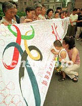 兩歲半小朋友王一山七日在媽媽的幫助下,在20米長(zhǎng)繪有2008顆心和“申辦奧運(yùn),北京好運(yùn)”的橫幅上簽名。橫幅由北京市八里莊街道延靜里的居民親手制作,表達(dá)人們熱切的申奧心愿。中新社圖 史利 攝