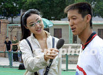 申奧萬里行:西部體育健兒的申奧情 2001年6月10日 22:25 ![]() 6月9日,加入“萬里行”車隊的影視明星劉蓓客串主持,采訪甘肅男子曲棍球隊。魏孝明 攝 ![]() 鳳凰衛(wèi)視主持人曾靜漪與甘肅體工隊少年武術(shù)隊員一起為北京申奧助威。呂振亞 攝