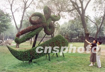 天津人民公園內(nèi)六月設(shè)立“迎奧運(yùn)”的草雕景點(diǎn),用八萬(wàn)多棵青草組成,表達(dá)了天津人民支持北京申奧的熱切心情。中新社圖 姬培棟 攝