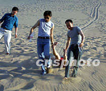 圖:編導李哲在沙坡上累倒 2001年6月13日 09:18 ![]() 鳳凰衛(wèi)視編導李哲小姐雖發(fā)揚“不怕苦不怕累”的精神,但終因體力不支,在沙坡上累倒了。圖為隊友把她從坡上“拖”下來的情景。中新社圖 魏孝明 攝