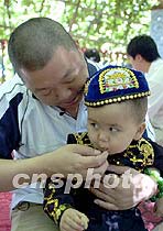 圖:維吾爾“小帥哥”試與臧天朔比“酷” 2001年06月17日 10:04 ![]() 歌星臧天朔6月16日在吐魯番葡萄溝里喜逢“對(duì)手”,一位維吾爾“小帥哥”試與歌星比“酷”。圖為老臧抱起“小帥哥”又親又逗。中新社圖 魏孝明 攝