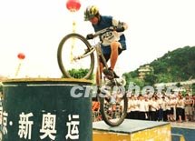 圖:福州車(chē)迷為申奧助興表演車(chē)技 2001年06月18日 21:41 ![]() 一名福州甲殼蟲(chóng)俱樂(lè)部的車(chē)手,18日在福州馬尾參加“閩臺(tái)青年單車(chē)神州大會(huì)師--祝北京申奧成功”活動(dòng)開(kāi)行儀式時(shí),表演自行車(chē)車(chē)技。中新社記者 劉可耕 攝