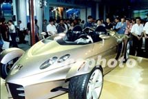 2001第九屆上海國際汽車工業(yè)展覽會18日開幕。圖為車展上一款外形獨特的跑車吸引了眾多觀展的上海市民。中新社圖 姜煜 攝