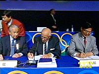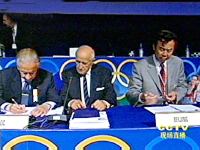 圖文:中國(guó)奧申委代表與國(guó)際奧委會(huì)簽定承辦協(xié)議 2001年07月13日 23:28 ![]() 北京市市長(zhǎng)劉淇簽定舉辦2008年奧運(yùn)會(huì)的協(xié)議. ![]() 中國(guó)國(guó)家體育總局局長(zhǎng)、中國(guó)奧委會(huì)主席袁偉民簽定舉辦2008年奧運(yùn)會(huì)的協(xié)議. 中新網(wǎng)莫斯科7月13日消息:在成功的獲得2008年第29屆夏季奧運(yùn)會(huì)的主辦權(quán)后,中國(guó)北京奧申委主席、北京市市長(zhǎng)劉淇,中國(guó)國(guó)家體育總局局長(zhǎng)、中國(guó)奧委會(huì)主席袁偉民與薩馬蘭奇簽定了舉辦2008年奧運(yùn)會(huì)的協(xié)議。 |