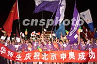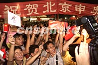![]() 北京天安門廣場十三日夜晚聚集數(shù)十萬民眾,慶祝北京申奧成功。中新社記者 毛建軍 攝