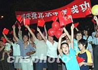 組圖:各地歡慶申奧成功 2001年07月14日 07:00 ![]() 13日晚,北京市民得知申奧成功后,紛紛走上長安街,舉行盛大的慶;顒。中新社記者 趙振清 攝 ![]() 13日夜,深圳市民為北京申奧成功而歡呼。中新社記者 陳文 攝