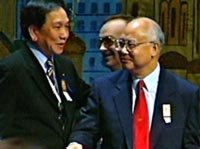 圖:何振梁接受國(guó)際友人的祝賀 2001年07月14日 07:28 ![]() 13日晚,北京申奧成功后,國(guó)際奧委會(huì)委員們向奧委會(huì)執(zhí)委何振梁表示祝賀。