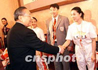 ![]() 7月13日,在莫斯科世界貿(mào)易中心舉行的國際奧委會112次會議中,北京獲得2008年奧運會舉辦權(quán)。北京申奧代表團在中國駐俄羅斯大使館內(nèi)慶祝申奧成功。國務(wù)院副總理李嵐清(左)接見代表團。 中新社記者 王瑤 攝