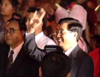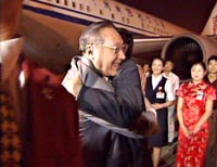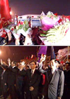 組圖:北京申奧代表團(tuán)7月14日晚載譽(yù)歸來 2001年07月15日 18:34 ![]() 中共中央政治局常委、中國國家副主席、中央軍委副主席胡錦濤(右一),十四日晚在北京首都機(jī)場熱烈歡迎北京申辦奧運(yùn)會代表團(tuán)從莫斯科載譽(yù)歸來。 ![]() 中國國家副主席胡錦濤十四日晚在北京首都機(jī)場迎接國務(wù)院副總理李嵐清率領(lǐng)的北京奧運(yùn)會申辦代表團(tuán)回到北京。