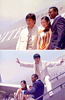 圖:成龍新作《尖峰時刻2》舉行首映式 2001年07月31日 15:55 ![]() 功夫巨星成龍最新完成的影片《尖峰時刻2》日前在洛杉磯直飛香港的飛機上進行首映,這是近四十年來第一部在空中飛行過程中舉行首映式的影片。圖為成龍、章子怡、克里斯·塔克在舉行首映式的飛機上。