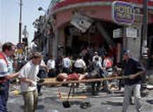 耶路撒冷爆炸:以內(nèi)政部長(zhǎng)說(shuō)十七人死亡(圖) 2001年08月09日 22:28 一名在爆炸事件中受傷的婦女正被抬上救護(hù)車(chē)。 | |||
