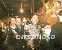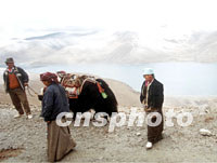 組圖:八月的西藏 2001年08月14日 16:50 ![]() 八月是西藏旅游的黃金季節(jié),藏民牽著牦牛在美麗的羊卓雍湖邊迎候游人,他們以為游客提供照相服務(wù)而增加自己的收入。中新社記者 滿會喬 攝 ![]() 八月的西藏拉薩,前往大昭寺朝拜釋迦牟尼佛像的藏民絡(luò)繹不絕。相傳這里供奉的釋迦牟尼佛像為唐朝初年文成公主帶入西藏。中新社記者 滿會喬 攝