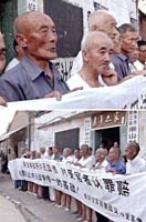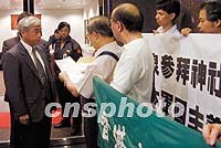 圖:江蘇民眾抗議小泉參拜靖國神社 2001年08月15日 17:19 ![]() 中國江蘇省崇山村村民,十五日在村委會前集會,抗議日本首相小泉參拜供奉著二戰(zhàn)甲級戰(zhàn)犯的靖國神社。日本侵華期間,有上百名崇山村民,無辜慘死在日本于此地進(jìn)行的細(xì)菌戰(zhàn)之中。 ![]() 香港多個(gè)團(tuán)體15日舉行示威游行,抗議日本首相小泉純一郎參拜靖國神社。圖為香港教聯(lián)會向日本駐港總領(lǐng)事館遞交抗議信函。中新社圖 盧峰 攝
