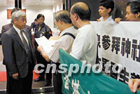 圖:香港團(tuán)體游行,抗議日本首相參拜靖國神社 2001年08月15日 20:32 ![]() 香港多個(gè)團(tuán)體15日舉行示威游行,抗議日本首相小泉純一郎參拜靖國神社。圖為香港教聯(lián)會(huì)向日本駐港總領(lǐng)事館遞交抗議信函。 中新社圖 盧峰 攝