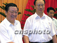 圖:原海南省委書記杜青林向新省委書記白克明“交班” 2001年08月16日 21:05 ![]() 八月十五日上午,中共海南省委召開干部大會(huì)。中共中央組織部副部長(zhǎng)黃晴宜宣布:杜青林不再擔(dān)任海南省委書記職務(wù),另有任用;任命白克明接任中共海南省委書記職務(wù)。在海南工作了九年多的杜青林與剛剛履新的白克明握手“交班”。中新社記者 關(guān)向東 攝