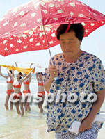 圖:沙灘上的模特與老人 2001年08月19日 16:10 ![]() 日前,在青島參加戴安娜2001世界精英模特大賽中國預(yù)選賽的模特選手,來到風景秀麗的金沙灘景區(qū)拍攝。圖為一位沙灘漫步的打傘老人匆匆從身穿泳裝模特身邊走過。中新社記者 錢興強 攝