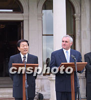![]() 正在愛(ài)爾蘭訪問(wèn)的中國(guó)總理朱镕基,九月三日在下榻的國(guó)賓館與愛(ài)總理埃亨舉行會(huì)談后,共同會(huì)見(jiàn)記者并回答提問(wèn)。中新社記者 孟慶雷 攝