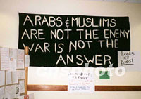 圖:美國一些校園出現(xiàn)反戰(zhàn)看板 2001年09月23日 15:32 ![]() 美國一些著名大學(xué)近日舉行和平集會(huì),呼吁政府勿用戰(zhàn)爭手段報(bào)復(fù)恐怖襲擊事件,以免傷害無辜。圖為紐約市立大學(xué)亨特學(xué)院的看板上寫著:“阿拉伯人和穆斯林并不是我們的敵人,戰(zhàn)爭不是解決問題的辦法!敝行律鐖D |
