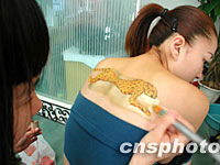 圖:北京女孩喜愛(ài)彩色體繪 2001年11月04日 18:08 ![]() 一個(gè)時(shí)尚女孩周末在北京體繪店內(nèi)請(qǐng)工作人員在她的后背繪上彩豹圖案。體繪出現(xiàn)在五千年前的古印度,在京城里,是專為酷哥靚妹們拍照,聚會(huì)時(shí)展示個(gè)性服務(wù)的。中新社記者 陳鋒 攝 |
