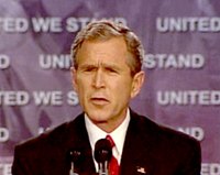 布什發(fā)表演講 呼吁美國民眾恢復正常生活 2001年11月09日 18:31 ![]() 布什8日在亞特蘭大發(fā)表全國講話說,一個四歲的小女孩曾寫信問他:"那些人都不知道我們是誰就攻擊我們。我們干嘛不告訴他們我們叫什么呢?"布什接著說:"我們會告訴那些恐怖分子我們是誰的,我們會告訴他們美國是誰。"布什的講話引來在場五千名聽眾起立鼓掌。