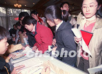 聚焦中國入世:中國高校采取舉措應(yīng)對(duì)"入世" 2001年11月10日 22:15 ![]() 入世將給中國經(jīng)濟(jì)帶來極大的商機(jī),使金融、國際貿(mào)易等經(jīng)濟(jì)專業(yè)成為今年研究生報(bào)名的熱點(diǎn)。圖為十日在2002年全國碩士生招生考試清華大學(xué)報(bào)名點(diǎn),場(chǎng)面十分火爆。中新社記者 張勤 攝