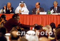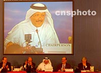 組圖:第四屆WTO部長會議審議通過中國入世 2001年11月11日 00:31 ![]() 第四屆WTO部長會議十日在卡塔爾首都多哈舉行會議正式通過中國入世。圖為世貿(mào)組織第四屆WTO部長會議組委會主席、卡塔爾財政經(jīng)貿(mào)大臣尤素夫·候賽因·卡馬爾敲錘通過中國加入世貿(mào)組織。中新社記者 錢興強(qiáng) 攝 ![]() 第四屆WTO部長會議十日晚在卡塔爾首都多哈舉行會議正式通過中國入世。圖為會議主席臺。中新社記者 錢興強(qiáng) 攝