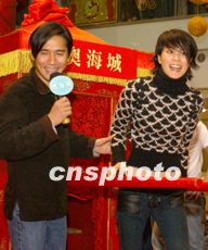 由香港大導演王家衛(wèi)監(jiān)制的電影《天下無雙》2月3日在香港奧海城舉行盛大推介會,香港新“影帝”梁朝偉親自迎接在劇中出演女主角的“歌后”王菲下花轎。中新社傳真 任晨鳴 攝