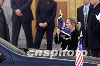 ![]() 美國(guó)總統(tǒng)布什與夫人二十一日上午抵達(dá)北京首都國(guó)際機(jī)場(chǎng),開始為期兩天的工作訪問(wèn)。中新社圖 毛建軍 攝 ![]() 美國(guó)白宮工作人員二十一日在北京首都國(guó)際機(jī)場(chǎng)為美國(guó)總統(tǒng)布什座駕安裝旗幟。中新社記者 毛建軍 攝