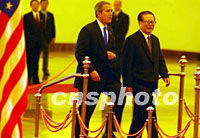 中新社北京二月二十一日電 題:江澤民主席主持儀式歡迎布什總統(tǒng) 中新社記者 朱大強 早春二月,美國總統(tǒng)喬治·沃克·布什來到北京,來到人民大會堂,受到中國國家主席江澤民的熱烈歡迎。 今天的大會堂北大廳,地上鋪著紅地毯,莊嚴的五星紅旗和星條旗分別豎立在檢閱臺兩側,威武的三軍儀仗隊正面排列、記者們的攝像和攝影鏡頭調準焦距…… 上午十一時,江澤民和夫人王冶坪在大會堂北大廳門口歡迎布什和夫人勞拉。兩國元首熱烈握手,這是自去年十月他們在上海會晤四個月后首次在北京見面。 布什總統(tǒng)身著深色西裝,系著蘭色領帶,春風得意。 在相互介紹雙方參加歡迎儀式主要官員后,江澤民主席與布什總統(tǒng)走上檢閱臺本國國旗一側,江澤民主席夫人王冶坪和布什總統(tǒng)夫人勞拉站立其后。軍樂隊奏響美國國歌和中國國歌。之后,布什總統(tǒng)在江澤民主席的陪同下,檢閱儀仗隊,當走到中國人民解放軍軍旗前時,布什立正向軍旗行注目禮。 訪問北京是布什時隔二十多年后故地重游。上個世紀七十年代中期,布什的父親老布什出使中國時,他曾來北京探望過父母。所以,布什對北京并不生疏,所不同的是北京的發(fā)展太快了。 更有新意的是今天巧為尼克松總統(tǒng)三十年前訪華紀念日,作為第五十四屆美國總統(tǒng),布什踏著尼克松、老布什的足跡訪問中國,使命重大。布什說:中國是一個偉大的國家,美國必須努力與中國發(fā)展良好、真誠的關系。 這是一個重要契機,此次江澤民主席與布什總統(tǒng)的會晤,將明確宣示中美兩國保持和擴大的合作領域,取得多方面的積極成果。 十分鐘的歡迎儀式結束了。在軍樂聲中,踏著中國的紅地毯,江澤民主席與布什總統(tǒng)像老朋友一樣,邊走邊交談著,走向會談廳。