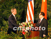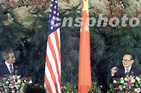 中新社北京二月二十一日十三時十五分電 本社記者譚宏偉現(xiàn)場報道:今天下午,中國國家主席江澤民和美國總統(tǒng)布什在結束大約一小時四十分鐘的會談后來到人民大會堂中央大廳共同會見記者。 江澤民說,在今天的會談中,我與布什總統(tǒng)回顧了中美關系三十年的歷程,深入討論了雙邊關系和當前國際形勢,達成了許多重要共識,取得了多方面的積極成果。 兩國元首將在預計三十分鐘的時間里,向早已等候在這里的三百多名中外記者介紹此次峰會的主要內(nèi)容并回答有關提問。記者會現(xiàn)正在進行當中。