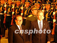 中國國家主席江澤民二十一日在北京人民大會堂舉行儀式,與訪華的美國總統(tǒng)布什檢閱解放軍三軍儀仗隊。中新社圖 賈國榮 攝