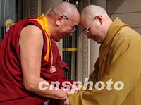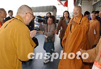 組圖:法門寺佛指舍利臺(tái)灣迎請(qǐng)團(tuán)抵達(dá)西安 2002年02月21日 19:49 ![]() 由臺(tái)灣佛教法師、信眾組成的法門寺佛指舍利赴臺(tái)灣地區(qū)瞻禮(供奉)恭迎團(tuán),二十一日下午乘機(jī)抵達(dá)西安咸陽(yáng)國(guó)際機(jī)場(chǎng)。圖為恭迎團(tuán)在機(jī)場(chǎng)受到熱烈歡迎。中新社記者 錢興強(qiáng) 攝 ![]() 法門寺將舉行佛指舍利赴臺(tái)灣地區(qū)瞻禮(供奉)法會(huì),來(lái)自大陸、港臺(tái)以及各地的佛教信眾匯聚西安。圖為中國(guó)著名法師圣輝(右)和中國(guó)藏學(xué)院副院長(zhǎng)那倉(cāng)活佛(左)親切見面。中新社記者 錢興強(qiáng) 攝