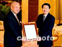 朱镕基會(huì)見董建華 中央全力支持香港恢復(fù)經(jīng)濟(jì) 2002年03月07日 15:11 ![]() 中國總理朱镕基七日上午在北京人民大會(huì)堂香港廳,向連任香港特別行政區(qū)第二任行政長官的董建華先生頒發(fā)任命書。中新社記者 賈國榮 攝