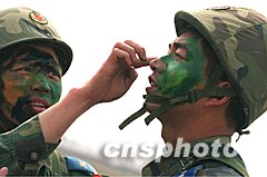 ![]() 解放軍空降兵某偵察兵部隊,四月在野外空降演練時,官兵們根據(jù)地貌互相在臉部涂抹迷彩進行偽裝。中新社記者 王麗南 攝